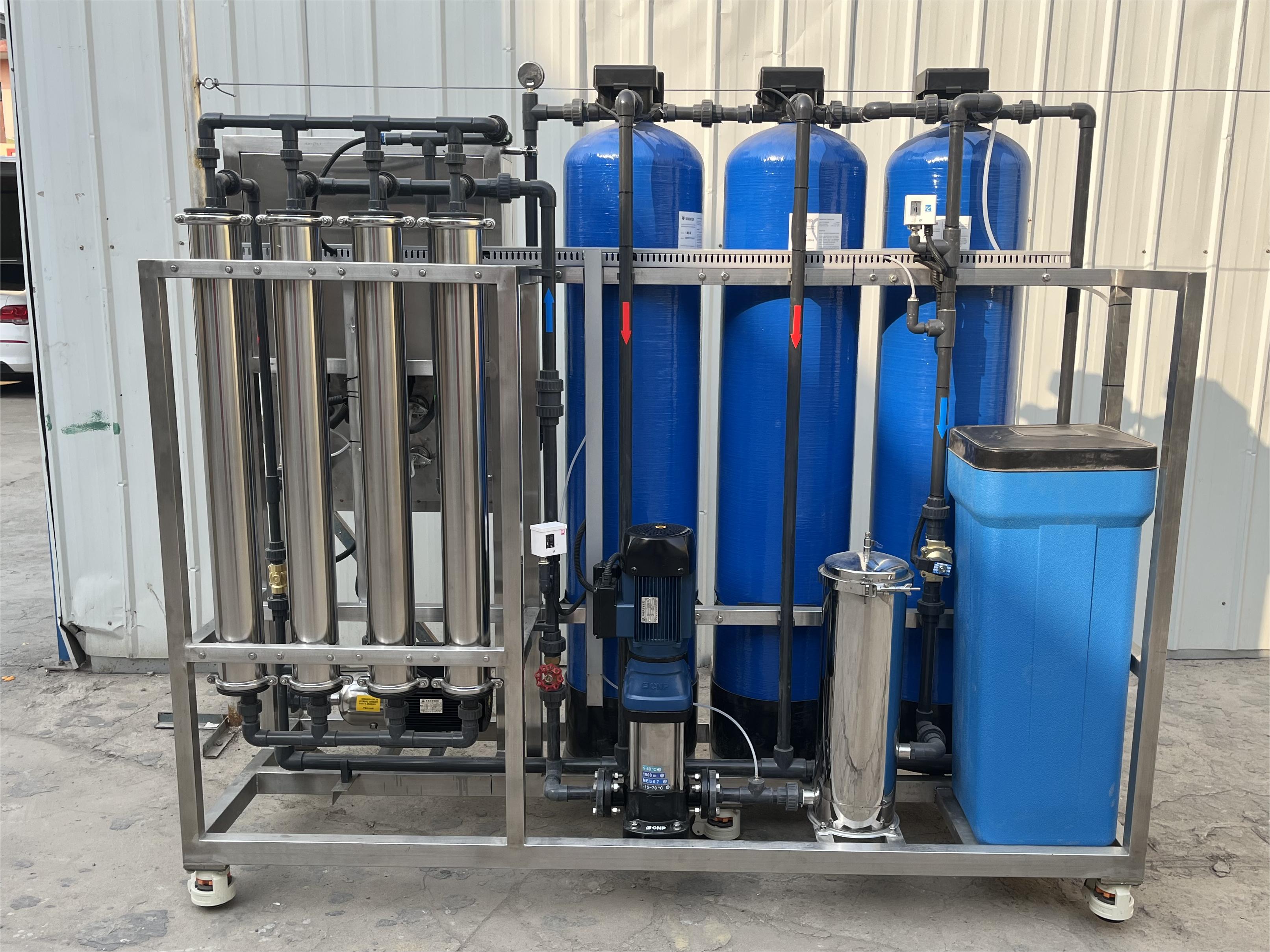 Raw water → Raw water tank → Raw water pump → Multi-media filter (quartz sand filter) → Activated carbon filter → Soft water processor → Precision filter → High pressure pump → Primary reverse osmosis (RO) device → Purified water tank → High pressure pump → Two Stage reverse osmosis → ultraviolet sterilization device → water point.